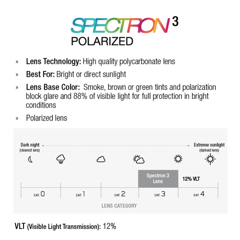 - Spectron 3CF: Cat. 3 polycarbonate lens (visible light transmission rate: 12%) with colored mirror coating (Color Flash): improves filtration of visible light by applying a mirror effect to the lens. Multipurpose lens suitable for all uses.