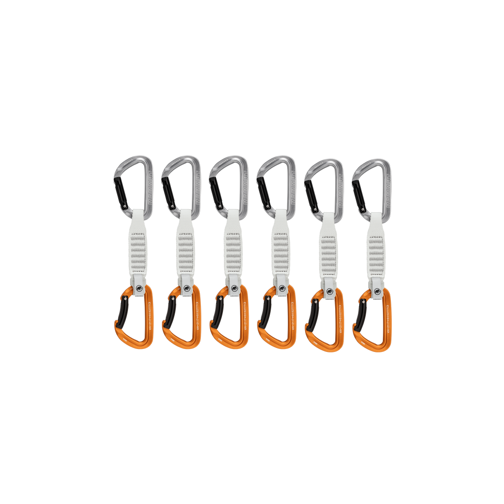 Sender quickdraws are designed for alpine climbing and high-performance sport. The combination of extremely light, compact carabiners and Dyneema® slings delivers an optimum balance of weight and performance. The straight gate with a ribbed grip area allows easier clipping, while the key lock system prevents snagging when clipping and unclipping. The sling varies in width and provides a firm grip; a robust sling protector keeps the lower carabiner in place and reduces wear. The bright orange indicator shows that the sling and protector are attached correctly to the carabiner. For users who need to save weight but still value ergonomics.